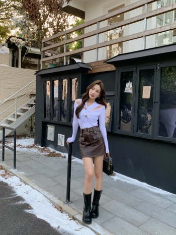 【Z827923】附腰帶口袋工裝風PU皮短裙