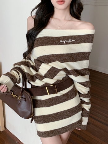 【Z828257】條紋不規則刺繡字母斜肩兩穿長袖上衣