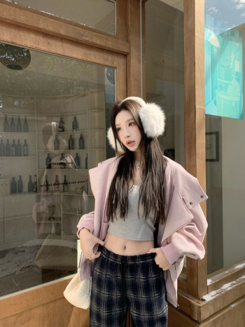 【Z828144】美式粉色工裝翻領連帽外套