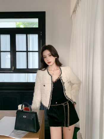 【Z828281】附鏈條高腰仿貂毛A字休閒短褲