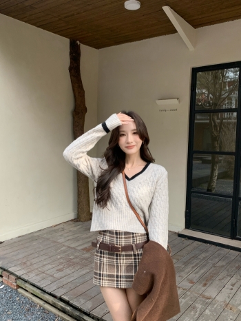 【Z828380】撞色V領針織毛衣+格紋裙套裝