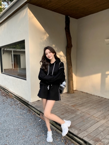 【Z828407】蝙蝠袖寬鬆休閒抽繩連帽短褲套裝