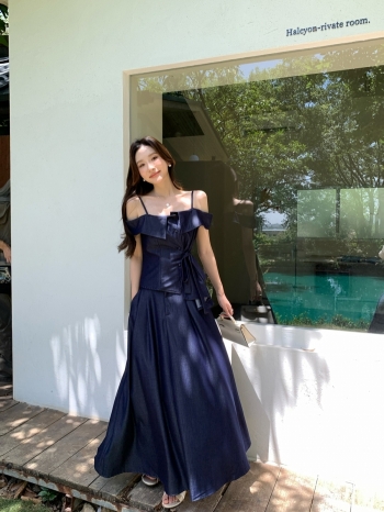 【Z828756】蝴蝶結側綁帶一字露肩水洗牛仔長裙套裝
