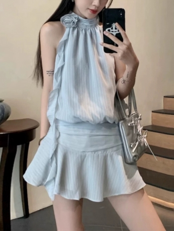 【Z828811】法式條紋立體花朵飄帶掛脖洋裝