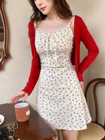【Z828797】蕾絲花邊碎花連身裙+罩衫