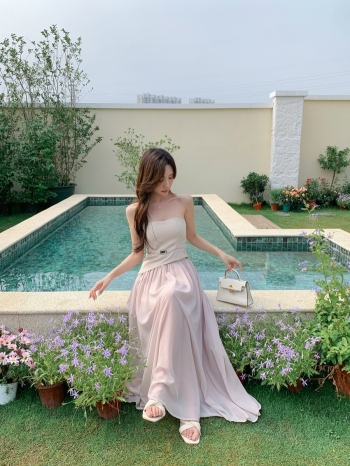 【Z828866】平口腰帶設計+網紗拼接長裙套裝