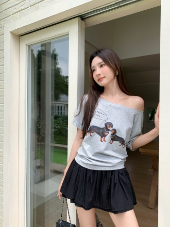 【Z828893】韓系項鍊狗狗印花斜領短T