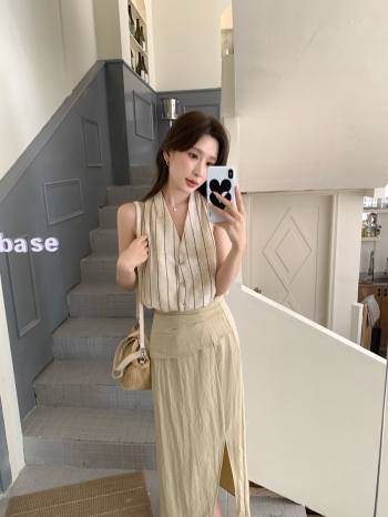【Z828967】法式掛脖削肩條紋無袖背心襯衫