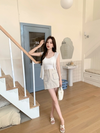 【Z828973】條紋拼接襯衫撕邊口袋短裙