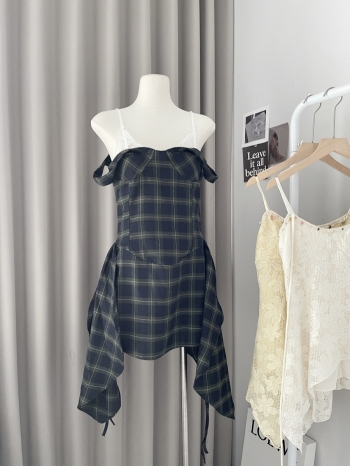 【Z829061】格紋抽繩睫毛蕾絲假兩件吊帶裙