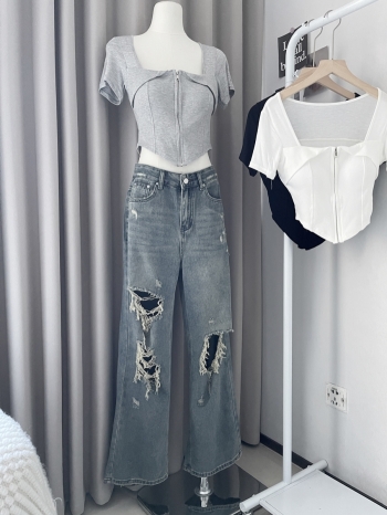 【Z829135】復古藍水洗破洞毛邊牛仔褲