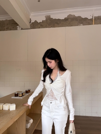 【Z829705】假兩件蕾絲拼接扭結長袖