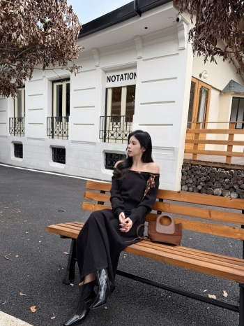 【Z829785】波點綁帶斜肩收腰針織衫