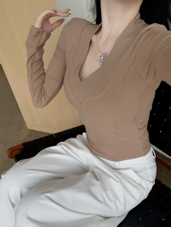 【Z829793】V領帶胸墊顯瘦加絨長T
