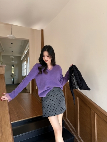 【Z829829】蕾絲波點網紗拼接V領毛衣