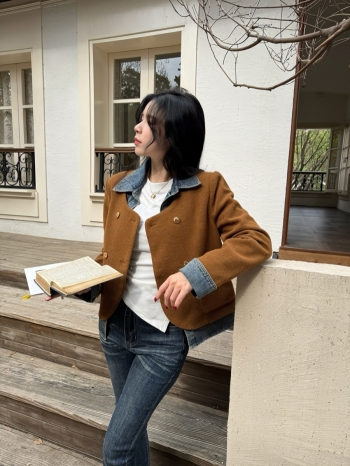 【Z829847】牛仔拼接假兩件毛呢外套