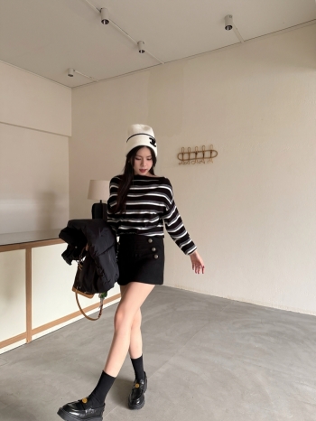 【Z829916】一字領鈕釦條紋針織衫