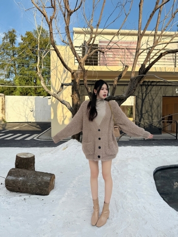 【Z829944】仿水貂毛排釦大V領口袋外套