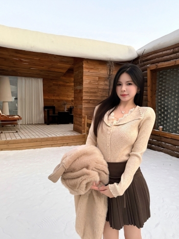 【Z829965】假兩件蕾絲翻領木耳邊針織衫