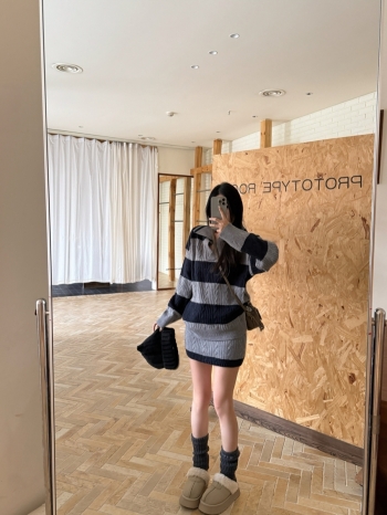 【Z830077】韓系chic翻領條紋毛衣針織裙套裝
