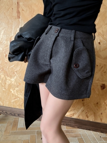 【Z830080】格紋壓摺口袋設計毛呢短褲