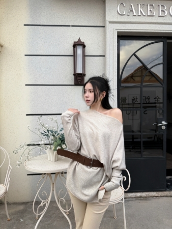 【Z830089】不規則一字肩坑條針織上衣(附腰帶)