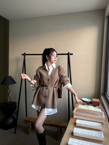 【Z830122】韓系V領針織罩衫+襯衫兩件套