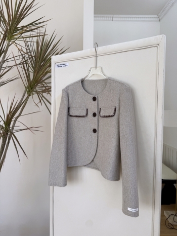 【Z830186】圓領翻袋縫線撞色排釦羊絨外套