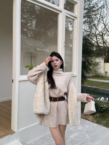 【Z830219】高領坑條針織衫+毛絨背心兩件套
