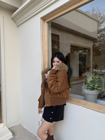 【Z830220】美拉德大毛領連帽麂皮絨外套