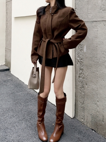【Z830278】老錢風立領綁帶毛呢鋪棉外套