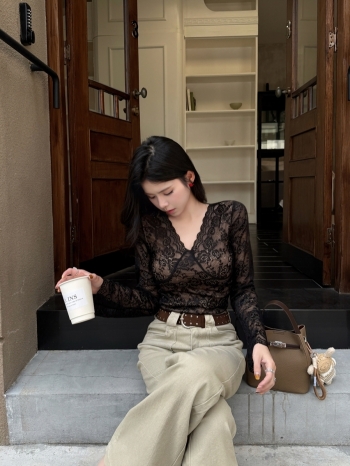 【Z830327】性感V領帶胸墊網紗蕾絲上衣
