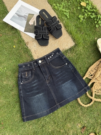 【Z830416】鉚釘腰頭後翻蓋設計牛仔短裙