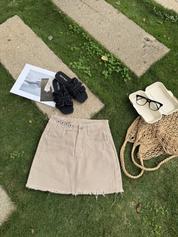 【Z830477】鈕扣腰頭燙鑽毛邊牛仔短裙
