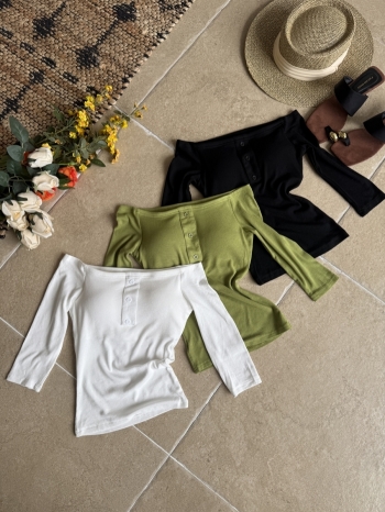【Z830553】羅紋一字領露肩排釦七分袖上衣