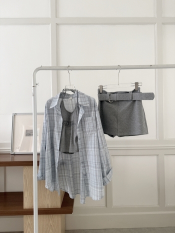 【Z830641】慵懶系美式格紋襯衫吊帶短褲三件套