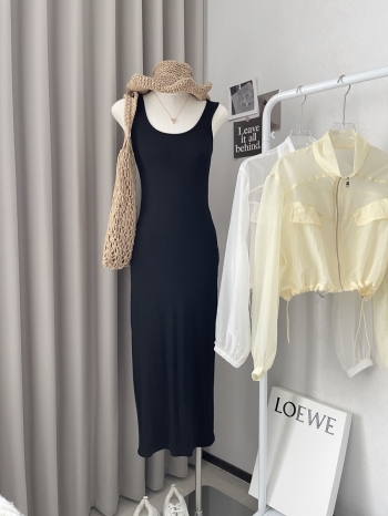 【Z828926】黑色簡約修身開衩羅紋背心裙