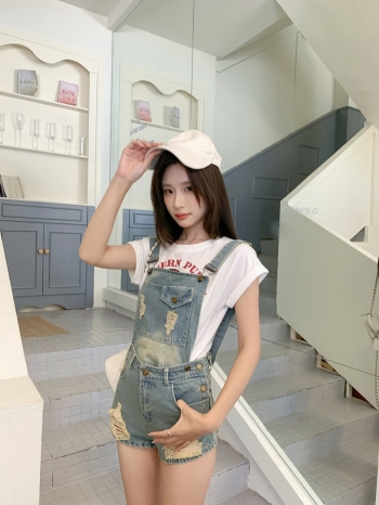 【Z828948】學院風洋氣破洞感牛仔吊帶褲