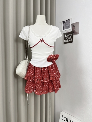 【Z829021】蕾絲邊短T+紅色碎花短裙