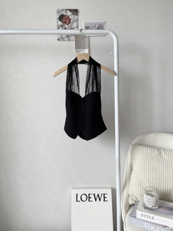 【Z829001】黑色拼接蕾絲掛脖露背上衣