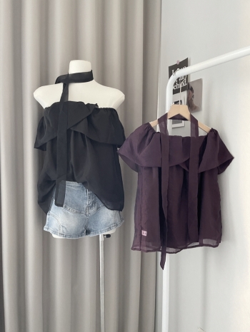 【Z829125】一字領荷葉邊飄帶雪紡衫