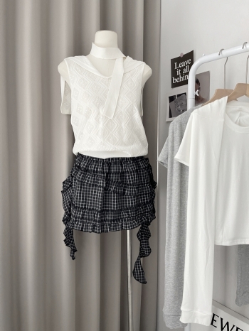 【Z829227】甜酷風不規則飄帶荷葉邊格紋裙