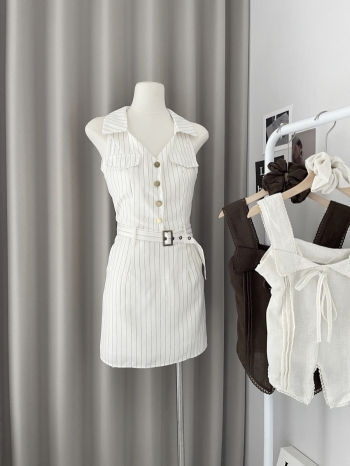 【Z829280】金屬釦條紋無袖洋裝(附腰帶)