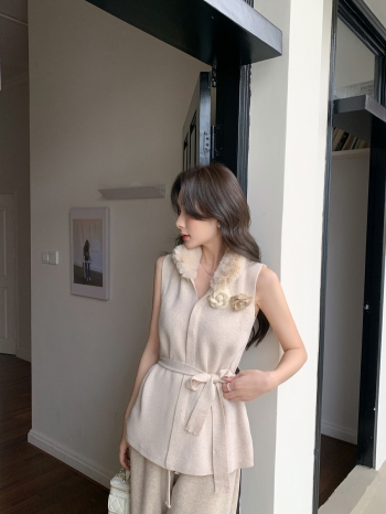 【Z828268】小香風花朵毛領無袖綁帶背心