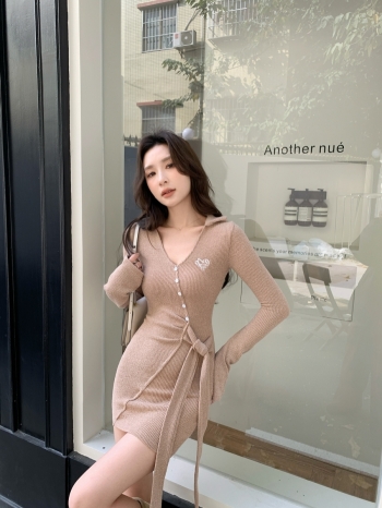 【Z828432】不規則刺繡綁帶修身翻領連身短裙