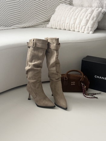 【Z829559】絨面尖頭皮帶釦褶皺長靴