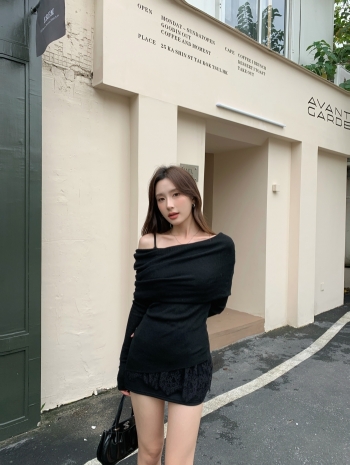 【Z827845】一字領針織上衣+蕾絲吊帶背心