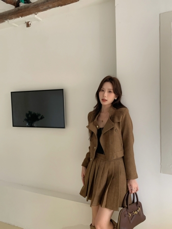 【Z827896】絨感翻領短版外套百褶裙套裝