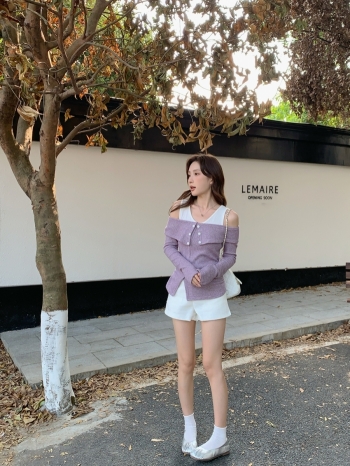 【Z827968】真兩件撞色一字肩長袖針織衫