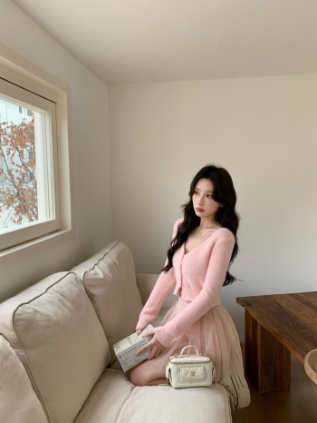【Z828253】性感蕾絲背心紗裙+軟糯V領露肩針織外套